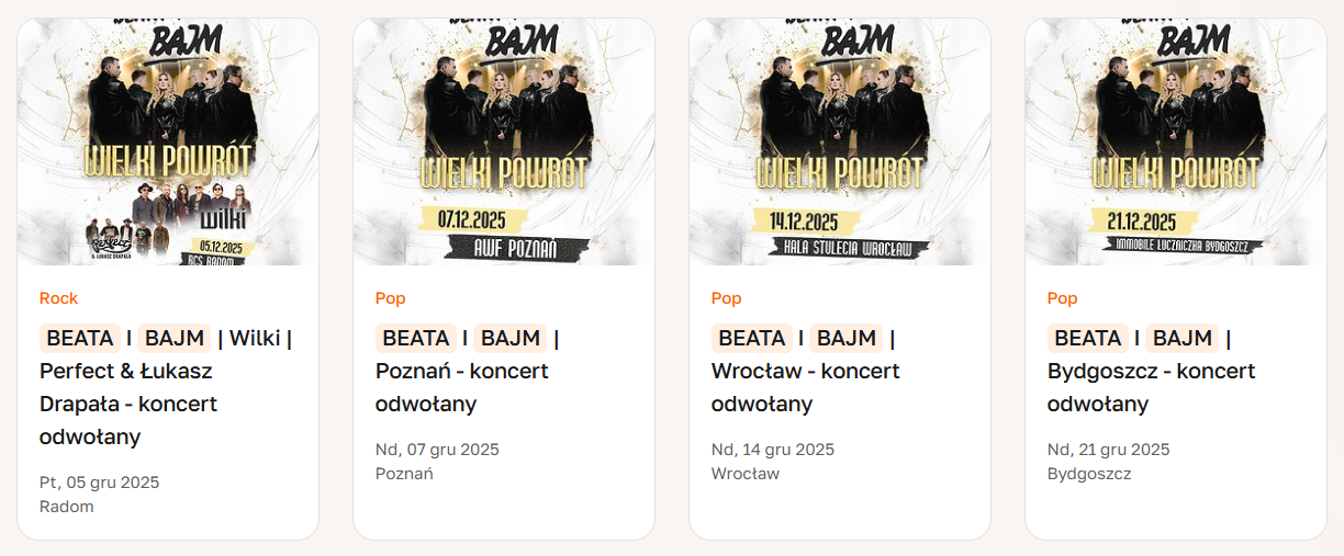 Z przykrością informujemy, że wydarzenie „Beata i Bajm – Wielki Powrót”, które miało odbyć się 21 grudnia w Hali Immobile Łuczniczka w Bydgoszczy, zostało odwołane przez organizatora. Osoby posiadające bilety prosimy o kontakt z organizatorem w celu uzyskania informacji na temat zwrotów oraz dalszych procedur.