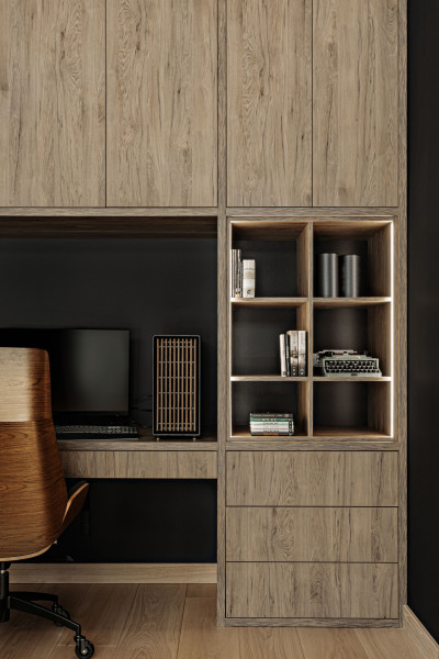 Architekt postawił na zestawienie głębokiej czerni, naturalnego drewna jesionowego i złotych akcentów, które pojawiają się choćby w detalach wykończeniowych czy okładzinach ścian. Wielkoformatowe płyty kamienne i spieki tworzą niepowtarzalny klimat i nadają wnętrzu ponadczasowego charakteru.
